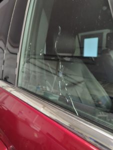 When it comes to door glass, there are two different types of glass that could be in your vehicle. The most common type is called tempered glass. When tempered glass breaks, it shatters into thousands of pieces, leaving behind sharp edges and shards of glass, and a mess in your vehicle. On the other hand, laminated glass will not create as much of a mess when it breaks. With laminated glass, there are two panes of glass with a sheet of laminate in between them, which means that when it breaks, the window stays mostly in tact, just showing a crack through it. Unfortunately, you can’t just put any piece of glass in your vehicle when it breaks, but this information helps us ensure we can get the correct glass for your car! See below for examples of each type of glass when it breaks. The first picture is tempered glass, and the second is laminated.